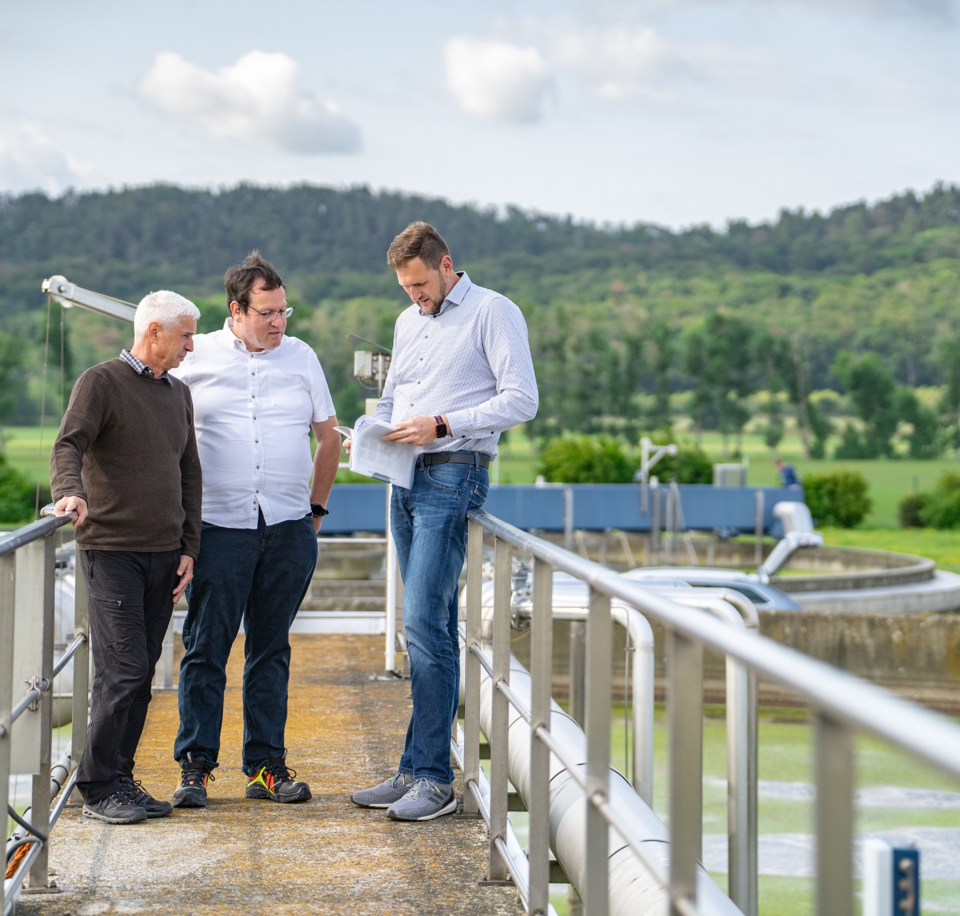 Die Arbeitsgruppe besteht unter anderem aus Prof. Dr.-Ing. Jürgen Wiese (Mitte), Professur für "Siedlungswasserwirtschaft - Schwerpunkt Abwasser" und den wissenschaftlichen Mitarbeitern Dr.-Ing. Ralf Tschepetzki (links) und Henning Oeltze, M.Eng. (rechts).